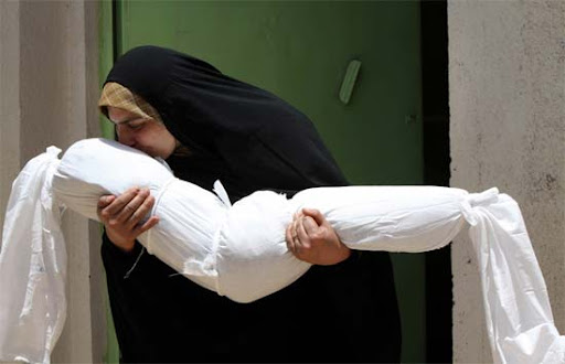 Seorang wanita mencium jenazah keponakannya berusia empat tahun, Zainab, yang tewas dalam pemboman Baghdad, terlihat pihak keluarga sedang mempersiapkan untuk dimakamkan di kota Syiah Najaf, 160 km (100 mil) selatan Baghdad , Irak, Senin, 21 Juni 2010. Anak itu tewas bersama dengan seluruh keluarganya - ibu, ayah, dan adik - pada hari Minggu, ketika pembom bunuh diri menyerang didaerah komersial Baghdad.